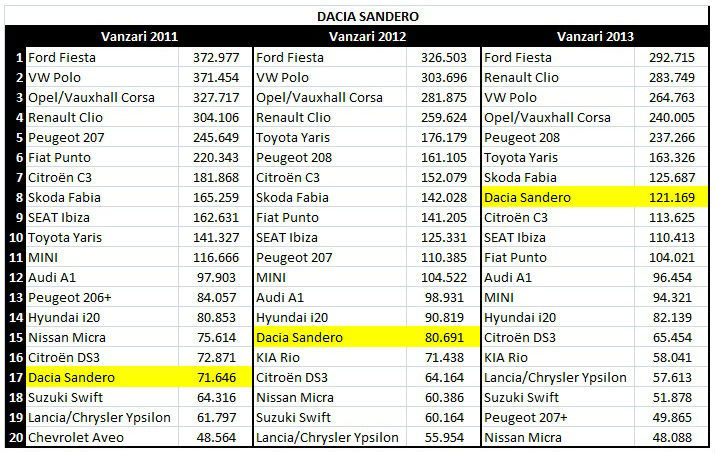 În 2013, însă, datorită noii generaţii Sandero, dar şi a versiunii pseudo-crossover Sandero Stepway, putem vorbi de o creştere spectaculoasă a vânzărilor, Sandero intrând în TOP 10, suflându-i în ceafă îmbătrânitei Skoda Fabia.