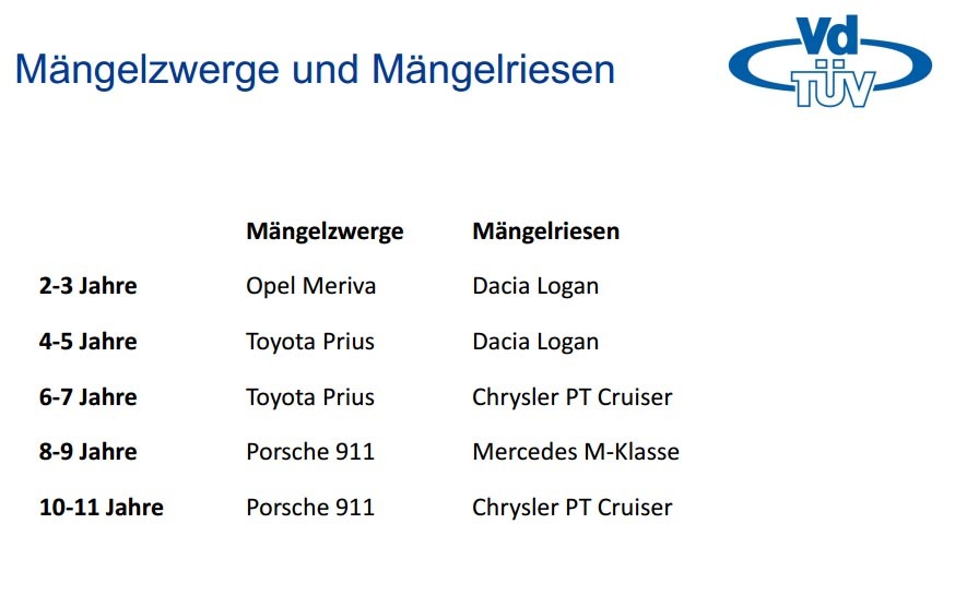 Rezumând acest studiu TÜV Report 2014, marii câştigători sunt Opel Meriva (cea mai mică rată a defecţiunilor din tot studiul), Toyota Prius II (modelul hibrid nu se dezminte, demonstrând fiabilitatea sistemului de propulsie alternativă) şi Porsche 911 (generaţia 996 rămâne una dintre cele mai de încredere maşini sportive).