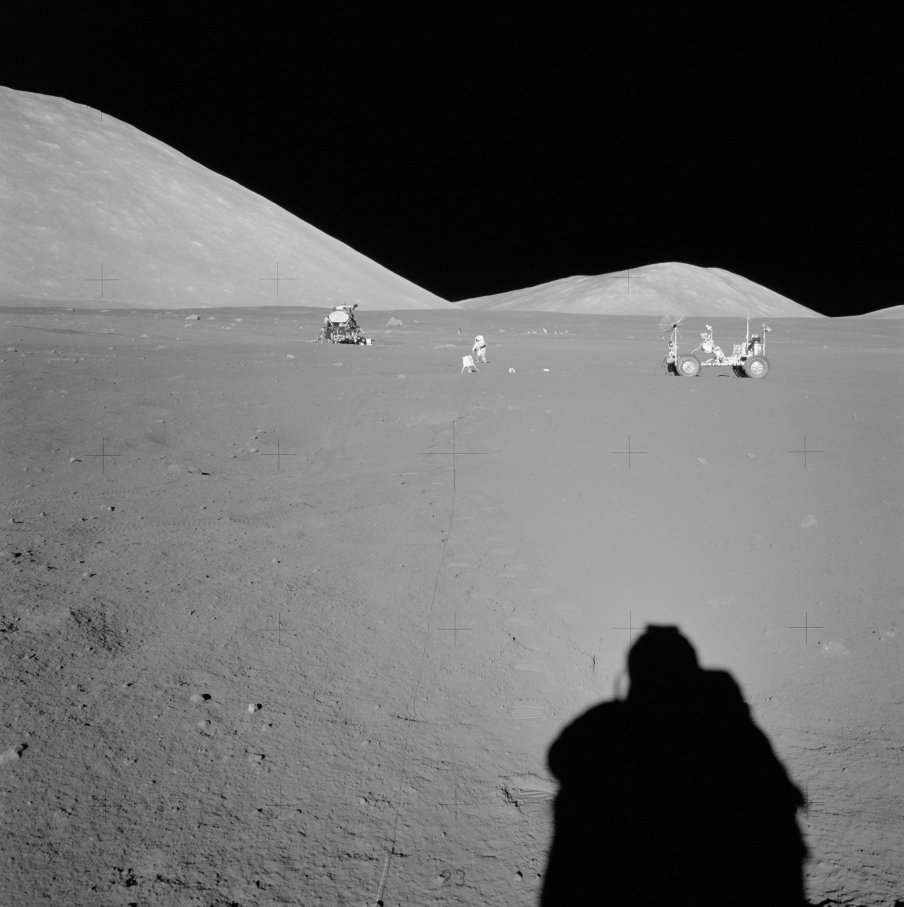 Fotografia din spaţiu în care se văd clar LRV-ul, urmele roţilor şi alte echipamente lăsate de astronauţi pe Lună