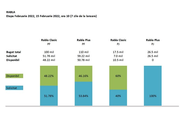 La programul Rabla Plus pentru persoane fizice, bugetul total este de 110 de milioane de lei, din care s-au solicitat 59,22 milioane (53,84%), fiind disponibile 50,78 milioane.