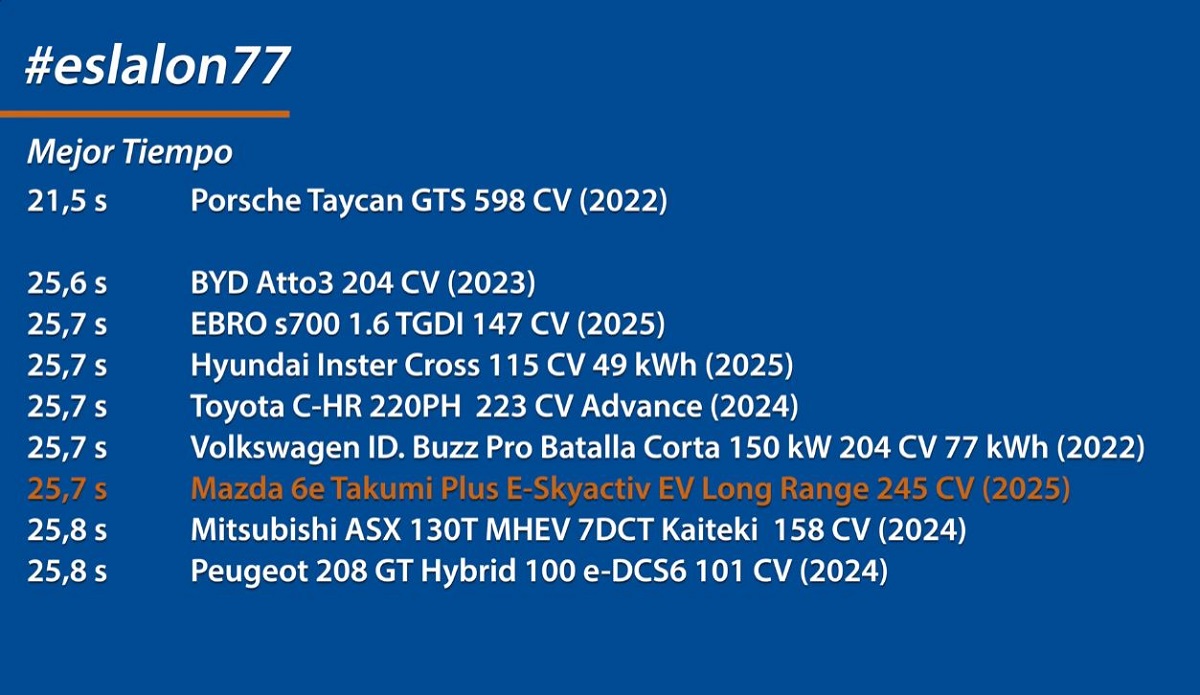 Recent, spaniolii de la KM 77 au supus Mazda 6e la faimosul lor test de manevrabilitate. Exemplarul testat are nivelul de echipare Takumi Plus E-Skyactiv. Mașina are o lungime de 4,92 metri și are două variante disponibile, una de 245 CP și una de 258 CP. Prima, are o capacitate a bateriei mai mare decât cealaltă, cu o capacitate de 80 kWh și o autonomie de 570 KM WLTP, un lucru atipic modelelor electrice. Modelul testat de spanioli este cel cu 245 CP.