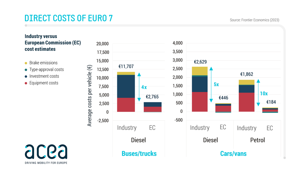 Cu ajutorul informațiilor furnizate de ACEA (Asociația Constructorilor Europeni de Automobile), Frontier Economics a realizat un studiu despre costurile reale ale implementării normelor Euro 7. Diferențele nu sunt deloc insignifiante, iar sumele ajung la valori de până la 10 ori mai mari față de cele estimate de Comunitatea Europeană.