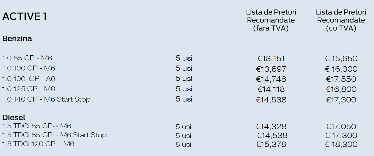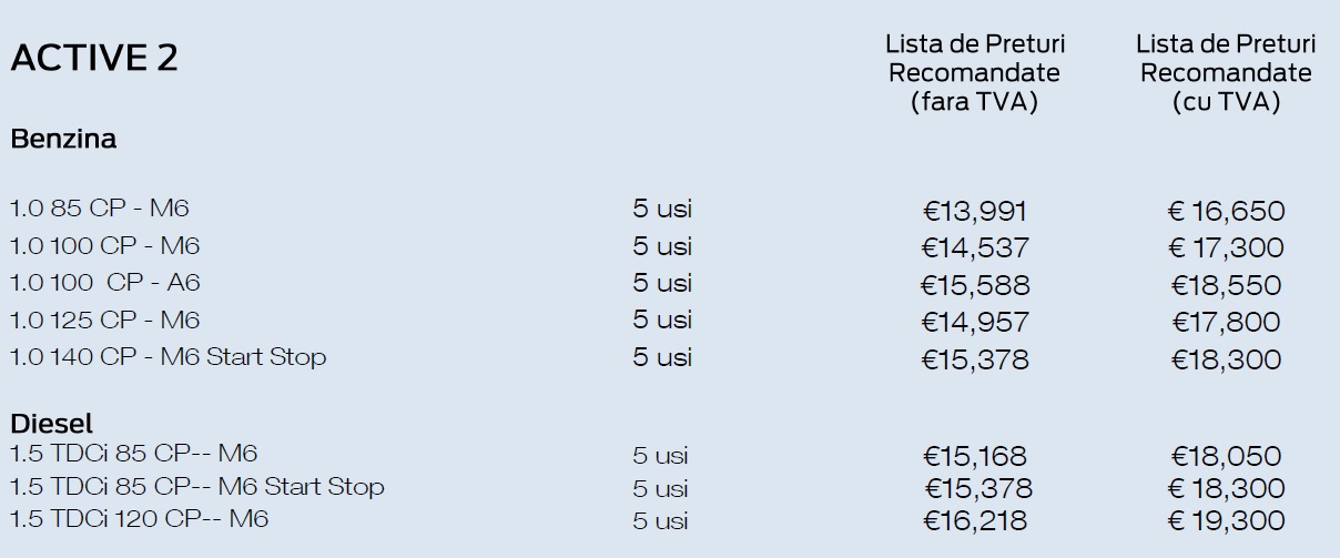 Noul crossover Fiesta Active se alătură celei mai complexe şi versatile game Fiesta prezentate vreodată în istoria de peste 40 de ani a reprezentativului model de clasă mică. Celelalte versiuni care acoperă majoritatea stilurilor de viaţă includ varianta premium Vignale, sportivul ST-Line şi versiunea stilată Titanium.