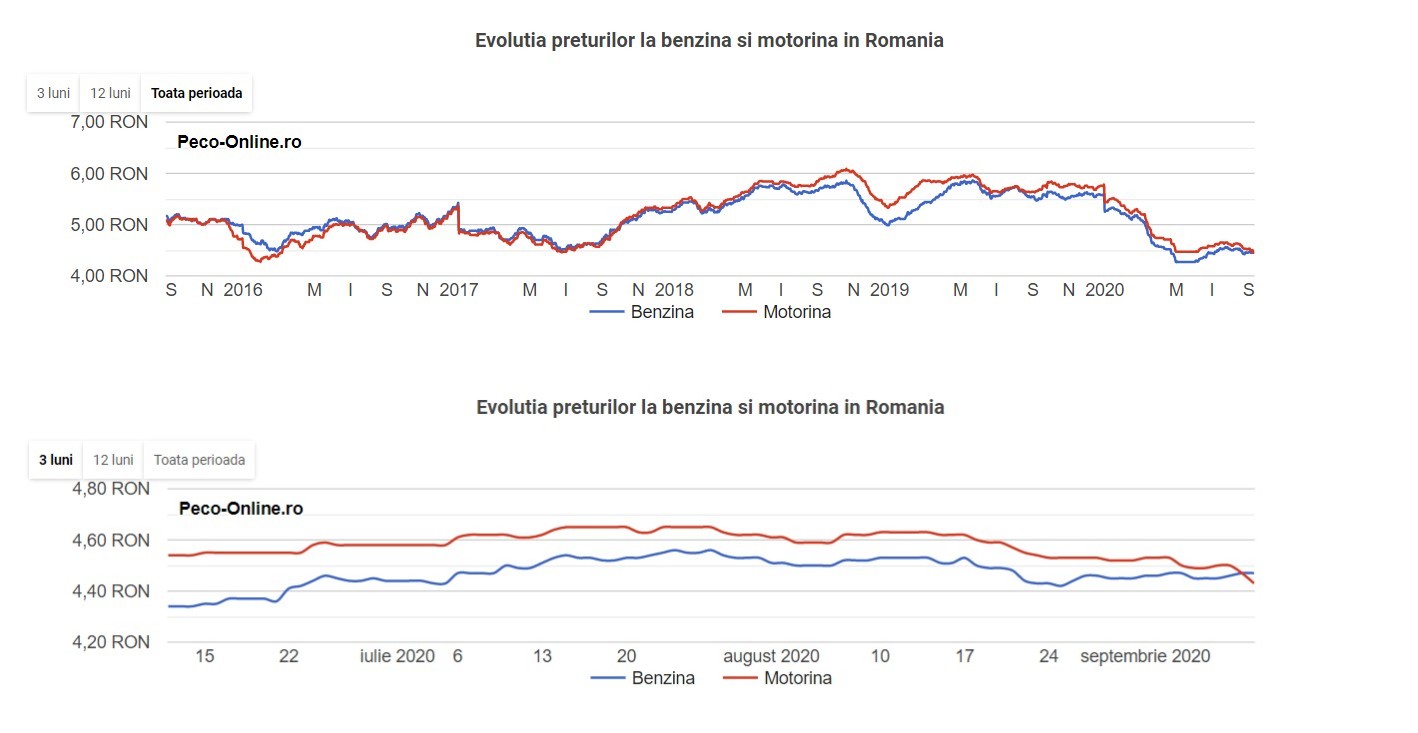 Aparent la fel de inexplicabilă este inversarea acestui trend în 2020. Urmărind graficul generat de sistemul Peco-online.ro putem vedea că prețul benzinei s-a menținut relativ constant în ultimele trei luni, în timp ce prețul motorinei a înregistrat un declin pronunțat de la începutul lunii septembrie.