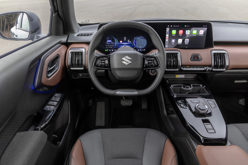 Avem de-a face cu o nouă filosofie de design pentru Suzuki, însă este una care păstrează caracterul robust și aventuros al producătorului japonez de automobile. Planșa de bord este împărțită în două trepte, cu guri de ventilație generoase, în timp ce consola centrală integrează un selector de viteze minimalist, rotativ, dar și comenzi pentru funcții precum One Pedal Drive, Autohold sau modurile de rulare. Versiunile cu tracțiune integrală primesc și un buton dedicat Trail Mode, care alterează setarea sistemului de control al tracțiunii pentru situațiile în care conduci pe drumuri accidentate.