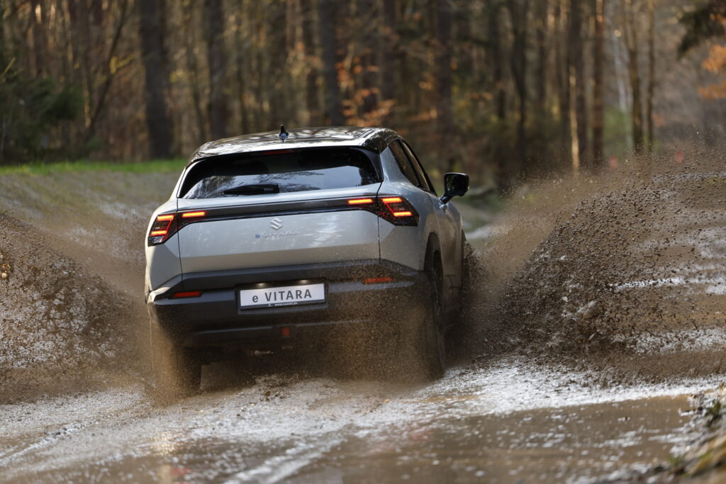 Toate versiunile primesc suspensie independentă pe puntea spate, ceea ce contribuie atât la confortul pasagerilor, cât și la stabilitatea în viraje. Acestea fiind spuse, am avut ocazia să conducem mașina și pe un circuit special amenajat, ocazie cu care am descoperit că eVitara se simte bine atunci când nu abuzezi anvelopele cu coeficient de frecare redus, destinate mașinilor electrice, dar nu te va lăsa la greu nici dacă ai un drum către Brașov și vrei să abordezi câteva viraje pe Cheia.