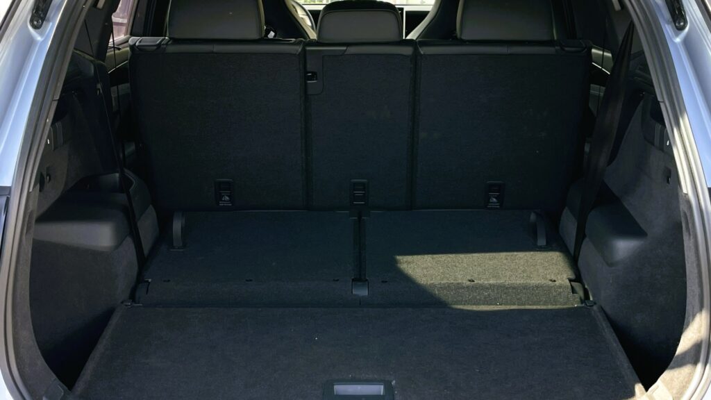 În configurația de bază, cu tracțiune față și cinci locuri, portbagajul lui Tayron măsoară 885 de litri. Pentru variantele PHEV, volumul în portbagaj scade la 705 litri. În cazul mașinii testate, o configurație cu șapte locuri și motorizarea 2.0 TDI cu tracțiune integrală, volumul în portbagaj cu rândul trei rabatat este de 805 litri. Dacă rabatezi și rândul doi de scaune, atunci volumul total ajunge la 2.090 de litri. Mai mult decât generos, spun eu.