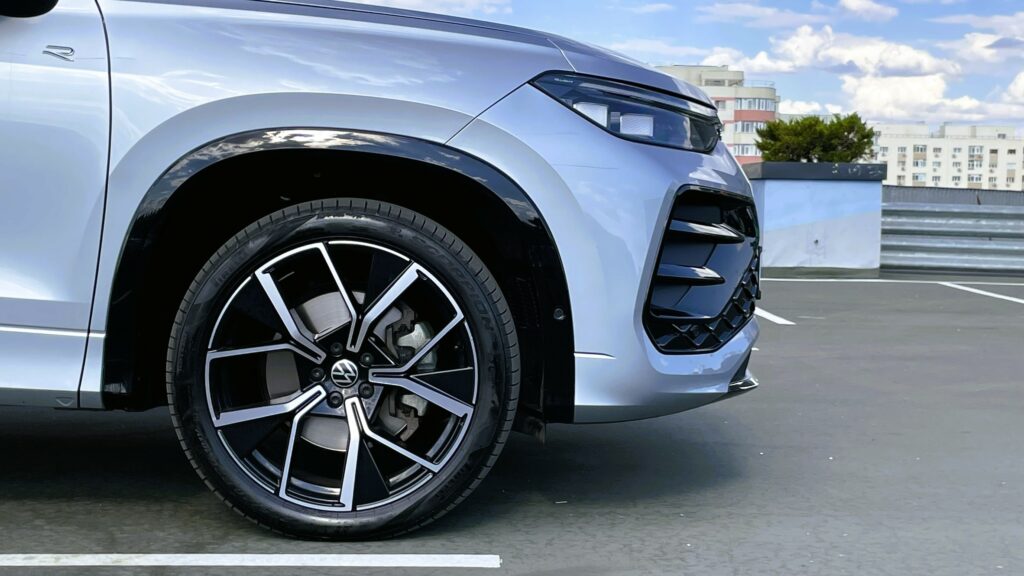 Pachetul R-Line cu care mașina testată de mine a fost dotată aduce și multe elemente decorative finisate în negru lucios – grile, capacele oglinzilor, pasajele roților etc. Exteriorul este completat, cel puțin în acest caz, de cele mai mari jante disponibile. Acestea măsoară 20 de inch în diametru.
