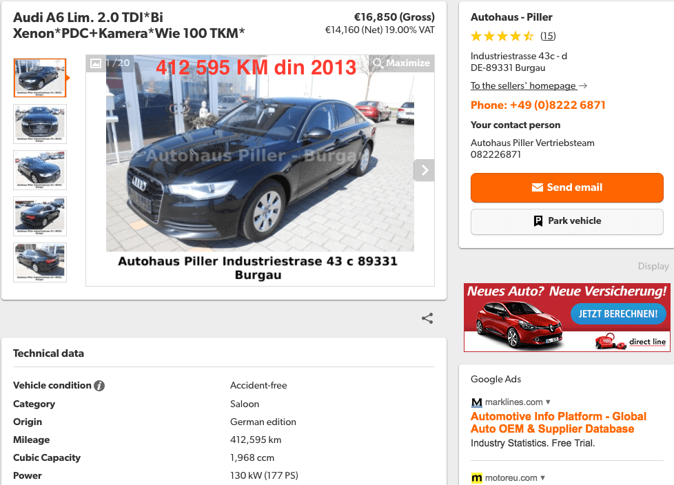 1. Audi A6 3.0 TDI cu 412.595 km la bord de vânzare pentru 16.850 euro. Ajuns pe piaţa noastră maşina scapă de 200.000 km şi capătă o etichetă pe care scrie 22.000 euro.