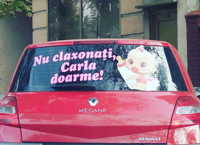 Proprietarul unui autoturism, într-o încercare de a-i convinge pe ceilalţi participanţi la trafic să nu mai abuzeze de claxon, a lipit pe maşină un abţibild pe care scria: “Nu claxonaţi, Carla doarme!”.